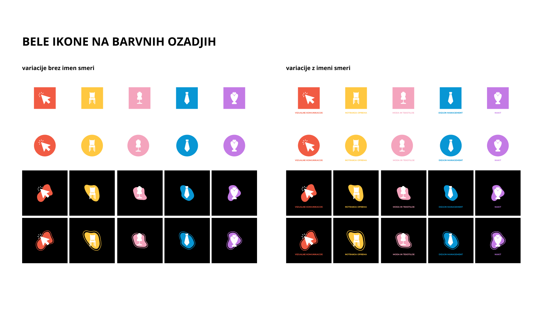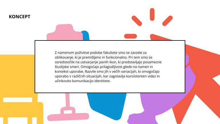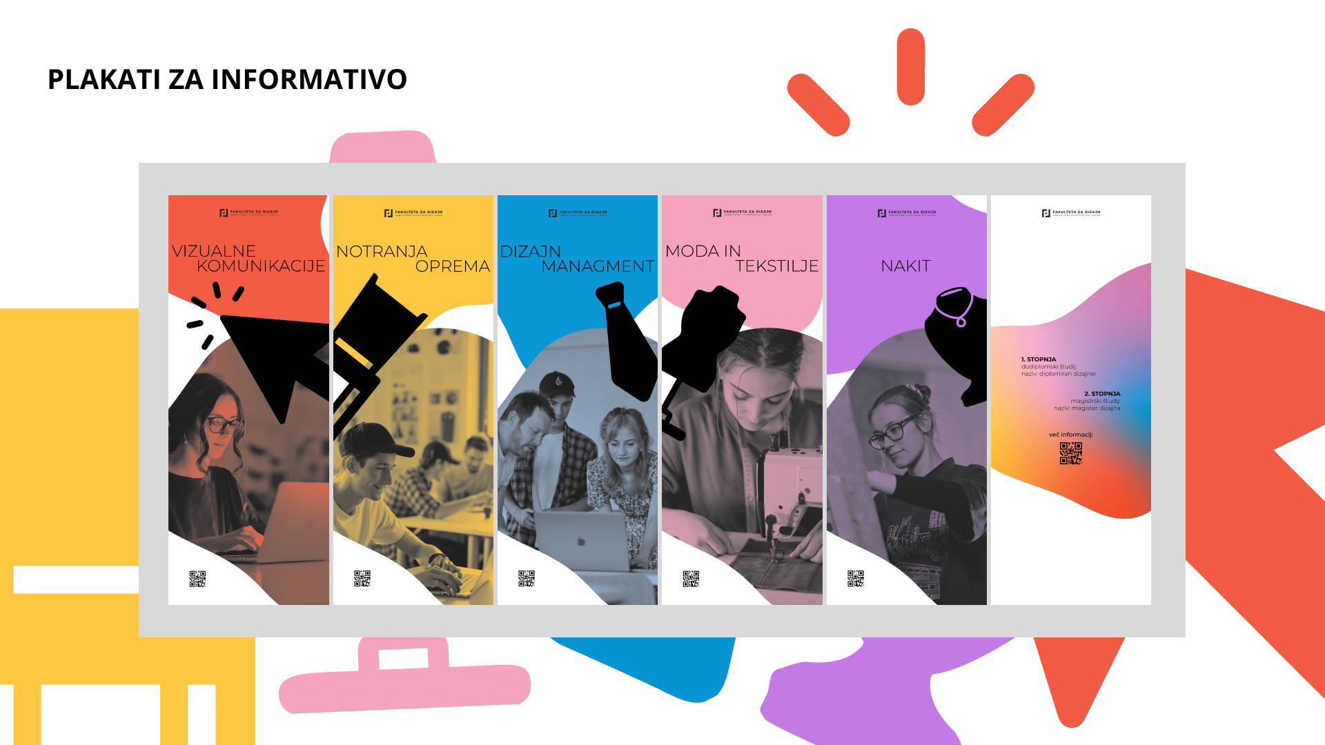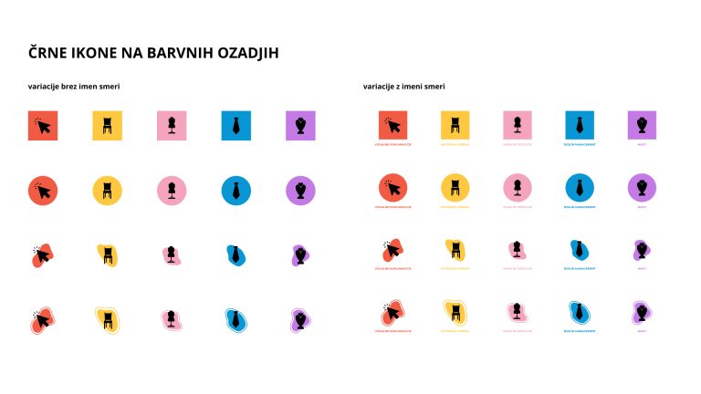 Prenovljena podoba FD je rezultat skupinskega dela v okviru študija na Fakulteti za dizajn. Prenova vključuje oblikovanje nove ikonografije za fakulteto, ki je jasna, razgibana in prilagodljiva. Poudarek je bil tudi na oblikovanju promocijskih materialov, ki temeljijo na novo ustvarjeni podobi. Fakulteta za dizajn ima smeri: vizualne komunikacije (rdeče), notranja oprema (rumeno), moda in tekstilije (roza), dizajn management (modro) in nakit (vijolično).