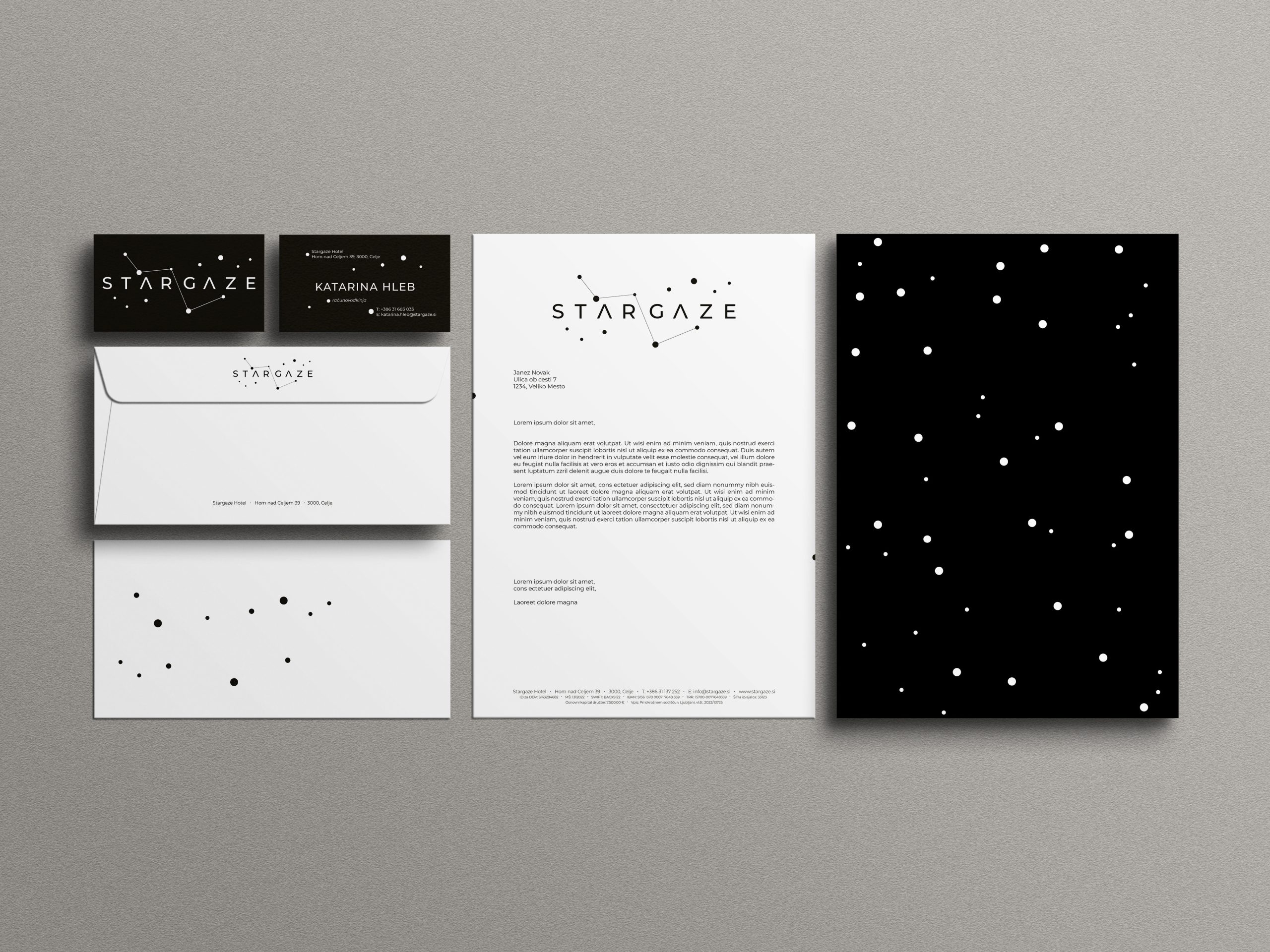 Stargaze Hotel, prestižna namestitev, umeščena v višave Posavskega hribovja, ponuja začasno zatočišče pred vsakdanjim življenjskim vrvežem in priložnost, da se prepustite lepoti noči. Ta luksuzni hotel je namenjen posameznikom, parom in majhnim skupinam (do 5 oseb), ki se poistovetijo z življenjskim slogom »nočne ptice« in v nočnih urah najdejo svojo energijo ter navdih. Za hotel sem ustvarila priročnik celostne grafične podobe (CGP), ki se dotika skic, simbola, tipografskega sistema, barvnega sistema, grafičnih elementov, poslovnih tiskovin ter promo materialov. Del hotela Stargaze sta tudi dve blagovni znamki hotela, Stargaze Cosmetics ter Stargaze Energy, ki s svojimi izdelki polnita butično trgovino hotela.